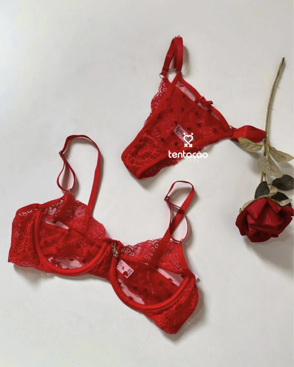 Calcinha: A calcinha combina tule na parte da frente e renda na parte de trás. Um delicado lacinho adorna a peça, e as laterais reguláveis permitem que ela se adapte com facilidade a diferentes tipos de corpo, proporcionando conforto e elegância.