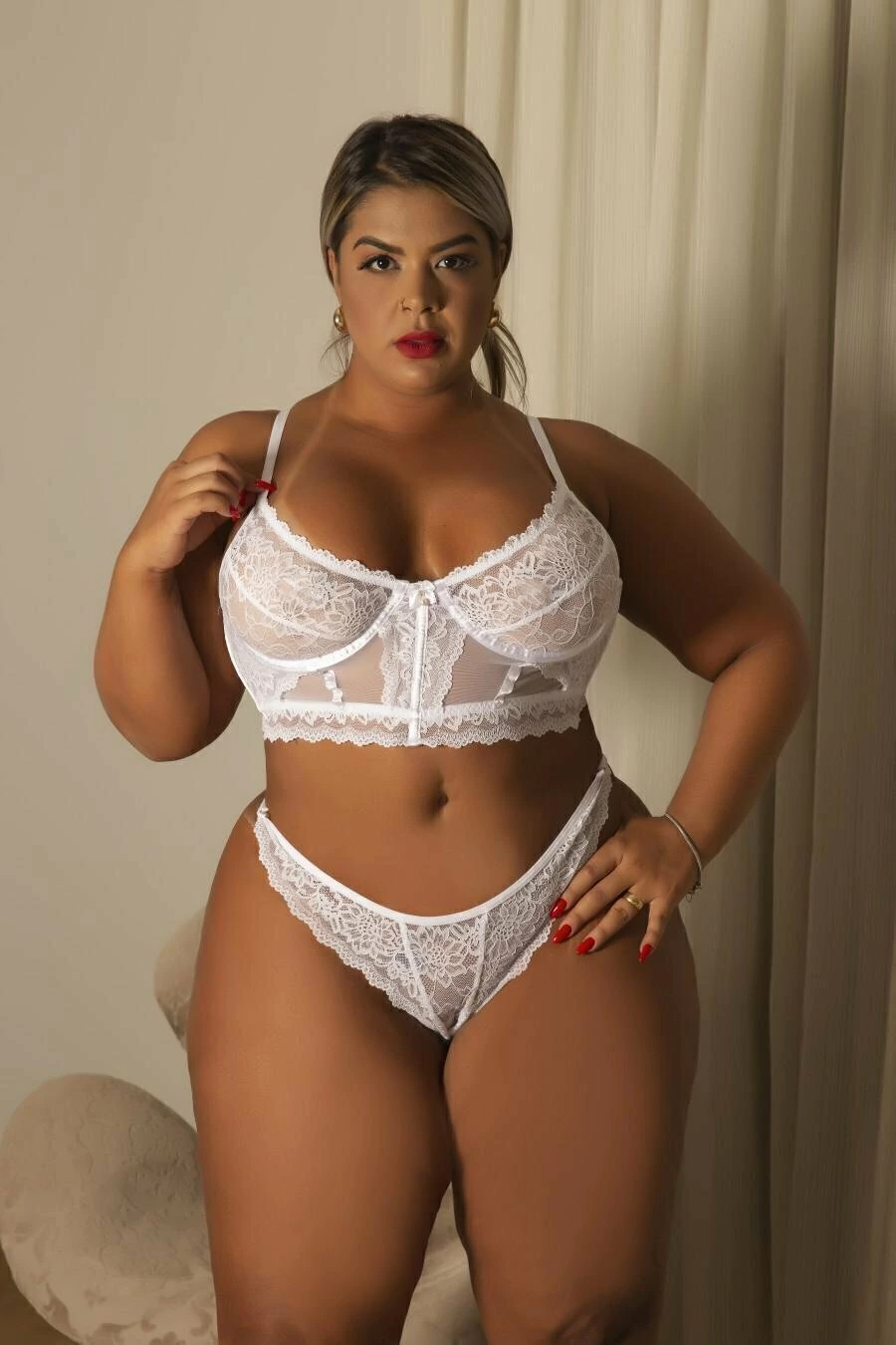 Conjunto sensual cropped rendado sem bojo. Sutiã feito em renda e tule, detalhe em laço e perola no meio do bojo. A Calcinha feita em renda e forro de malha, detalhe de elástico na parte de trás da calcinha. Este conjunto é a definição perfeita de sensualidade e elegancia.