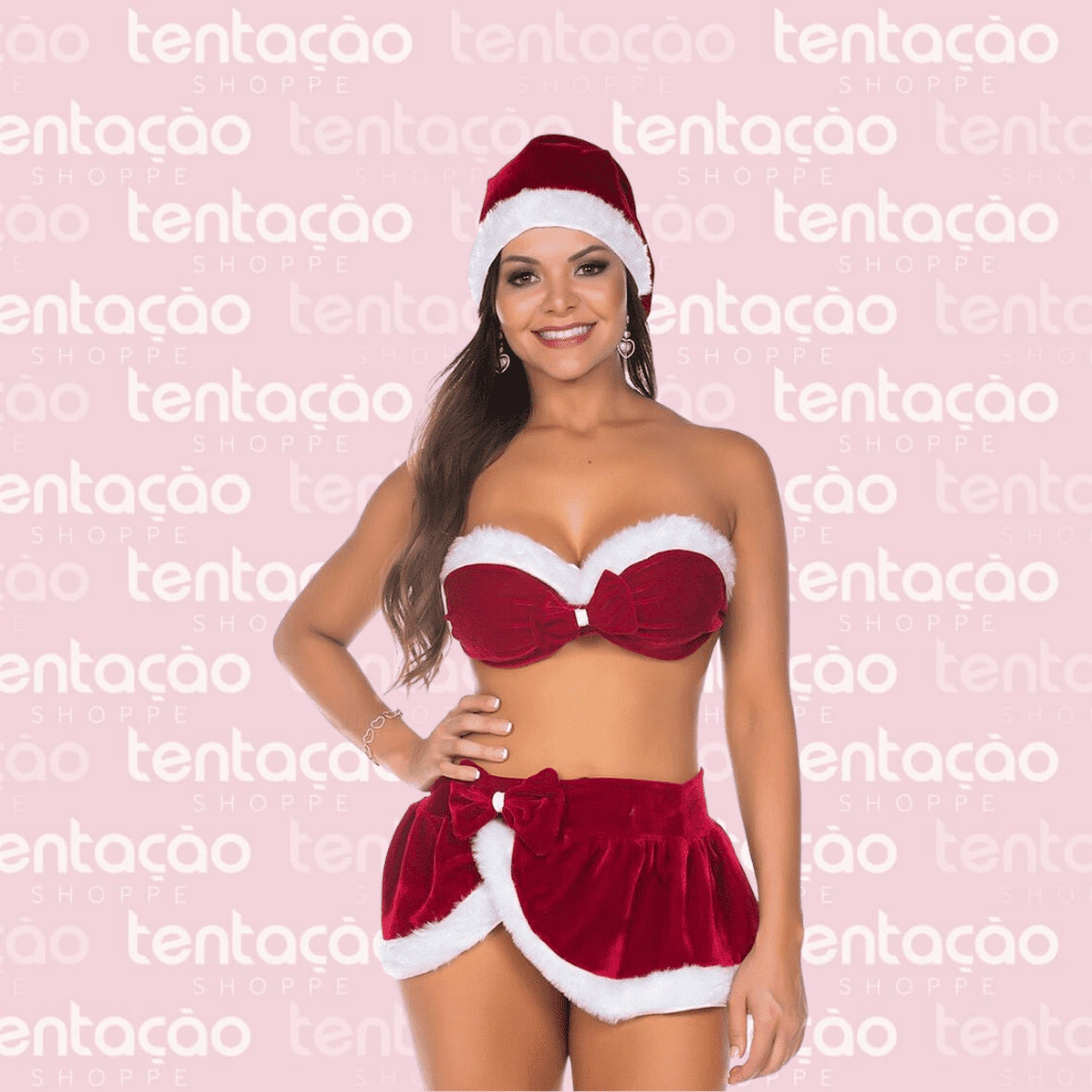 Fantasia Mamãe Noel é confecccionada em veludo e é composta por uma instigante saia que valoriza o seu bumbum e um belo top, acompanha um delicado capuz.