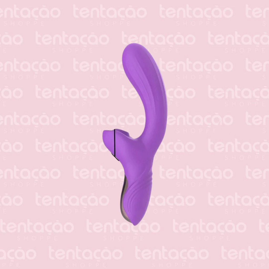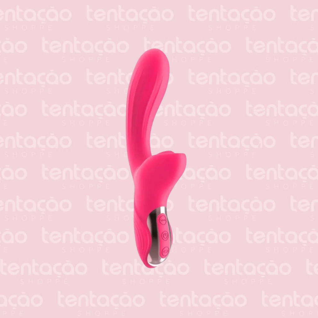 Vibrador ponto G com estimulador clitoriano por ondas de pressão e relevos massageadores. Possui toque suave, aveludado e detalhes metalizados em sua base.